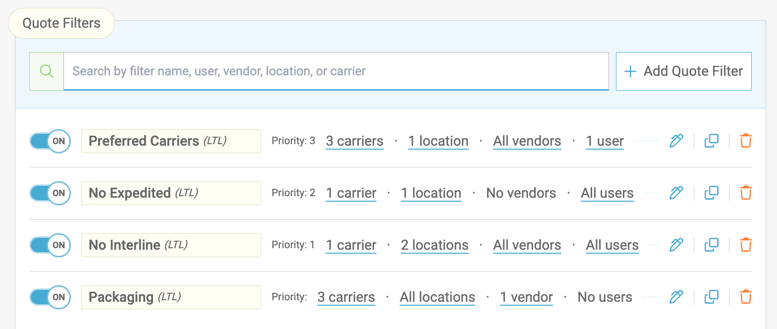 Quote Filters: Refine rate options across lanes, users, service levels, and more.