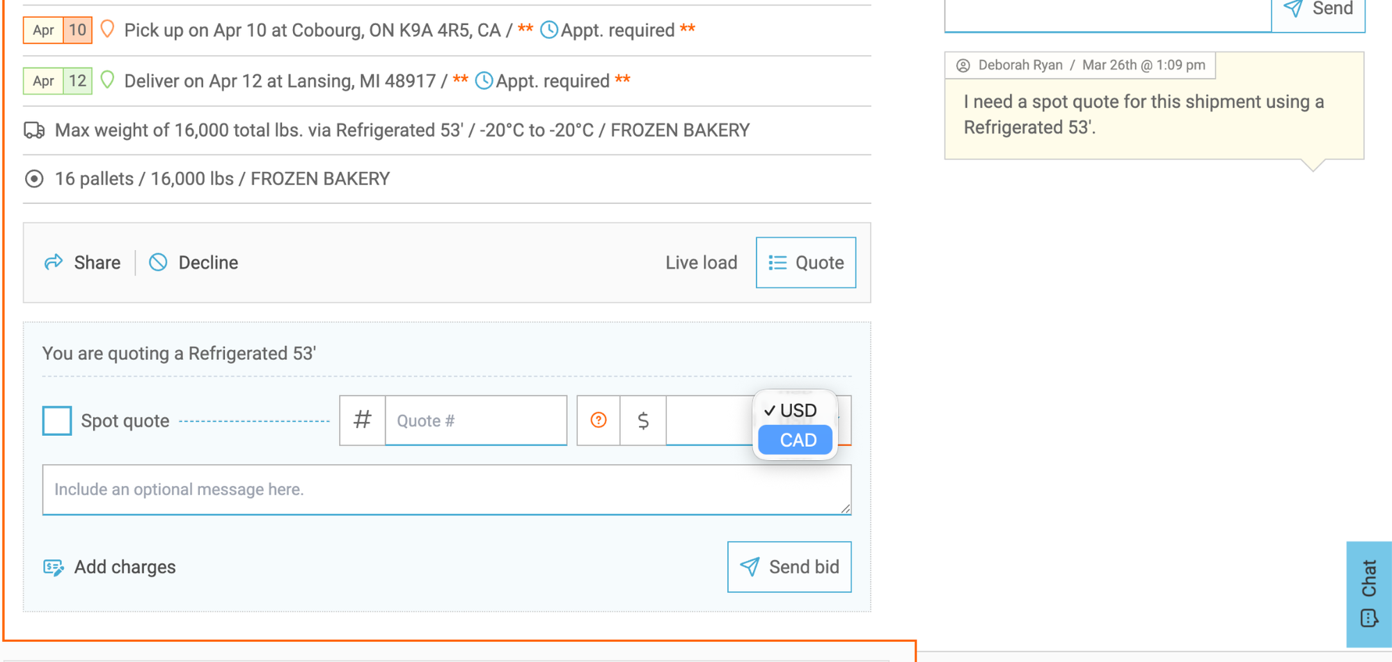 Canadian Currency Support: Spot Quote & Truckload shipments have this option available on both the Carrier and Shipper side.
