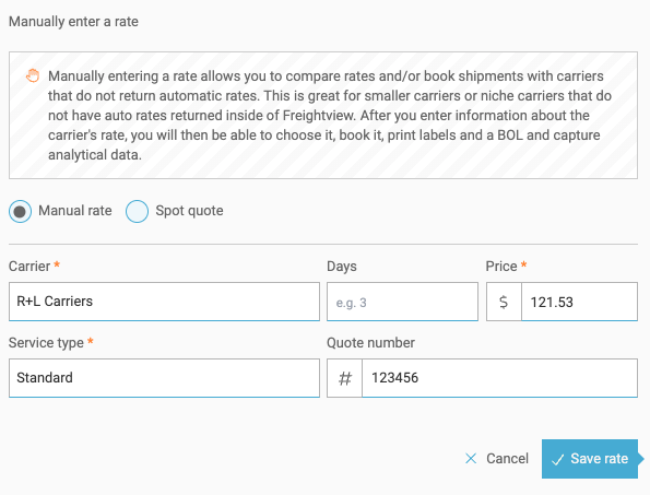 We want Freightview to accommodate all of your LTL needs, so we've added the ability to include those with carriers that are not connected via API - by entering a Manual Rate.
