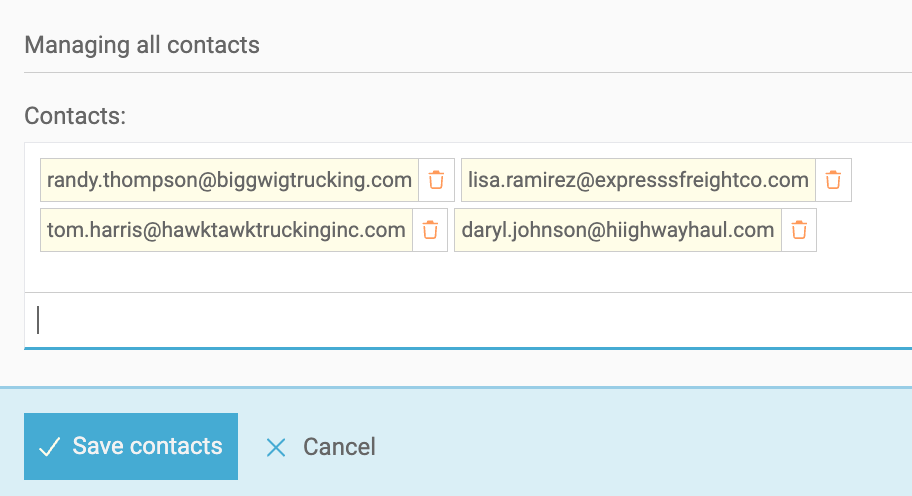 Select + Add spot-quote group. From there you can either click the pen to edit the All Contacts list or create groups of your choosing. Groups allow you to batch select addresses by lane, mode, product, equipment type, etc. We will keep a compiled list of all the addresses entered in any group under All Contacts.