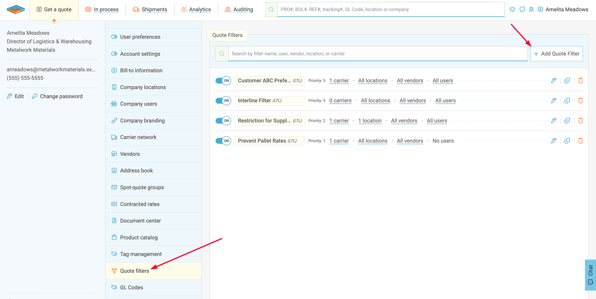 Users with access: go to your Freightview Settings > Quote Filters. From there, click + Add Quote Filter. These settings allow you to customize filters for different teams, facilities, or shipping scenarios.