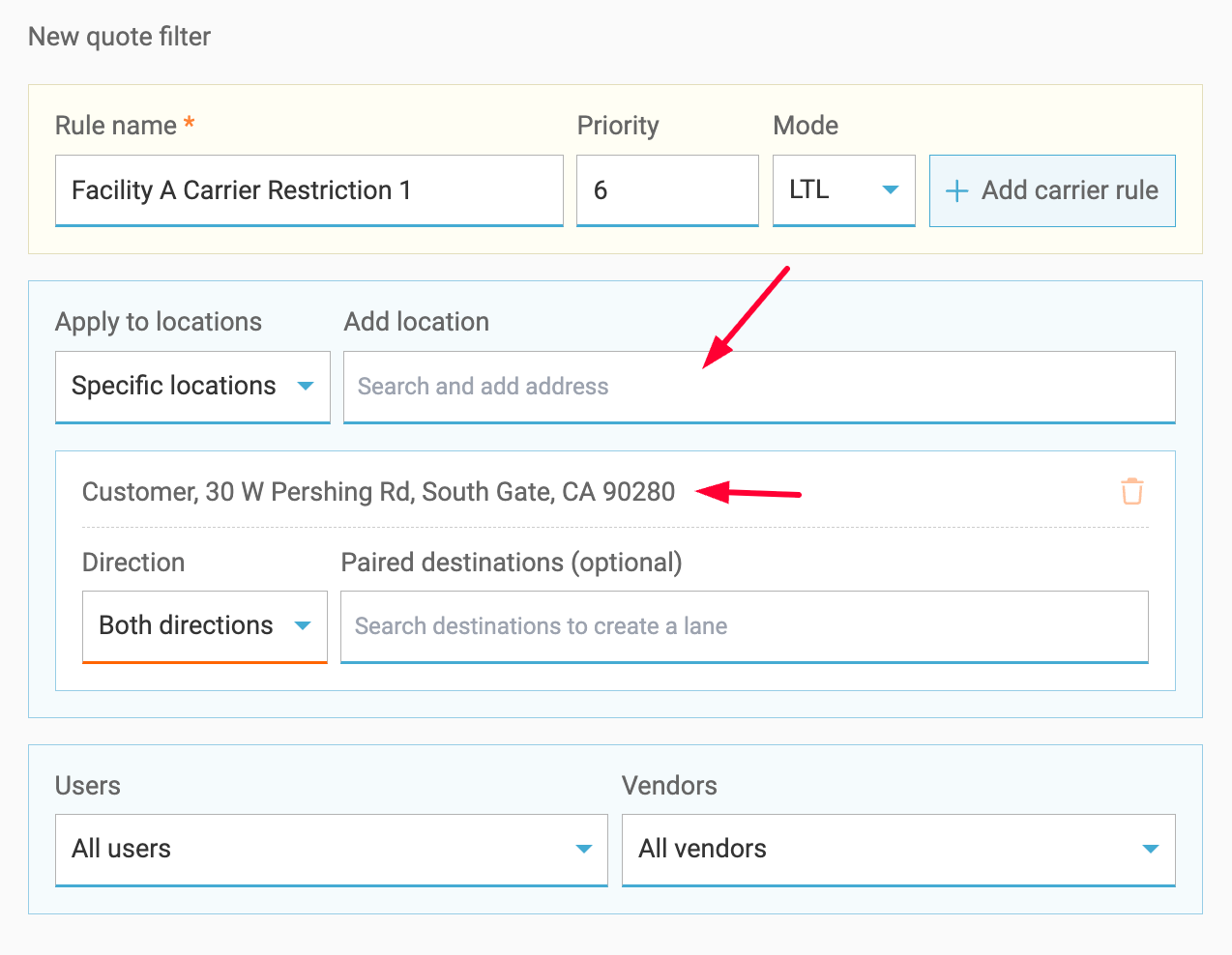 Quote Filters let you control which carriers appear based on the facility you’re shipping from or to. This is perfect for prioritizing carriers that perform best in certain regions—or limiting options where service coverage is tighter.