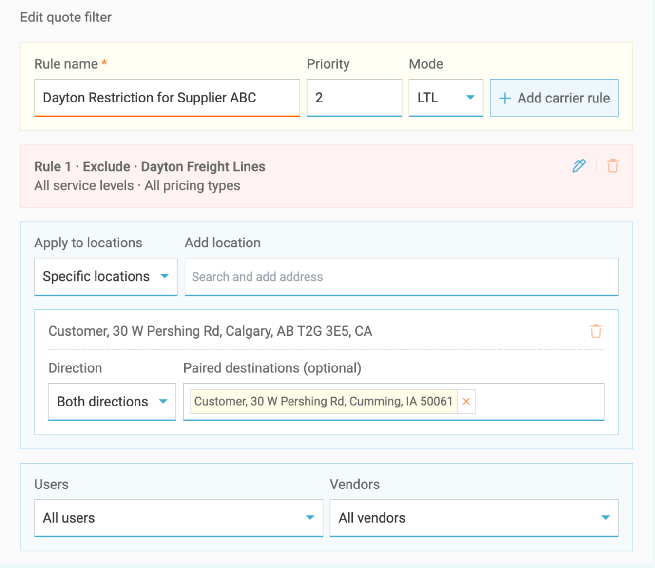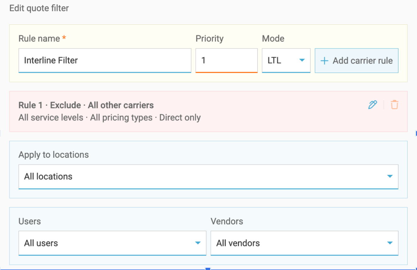 Set rules that control which carriers, service levels, and pricing types each vendor can see when quoting. Filters can be customized at the individual vendor level, so each partner only sees the options you want them to use.