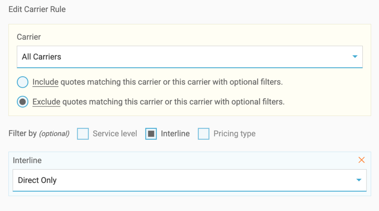 To segment: Create a filter for LTL mode, then add a carrier rule that excludes interline services across one or all carriers.