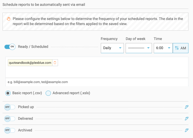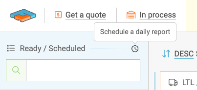 This feature automatically sends a CSV file of shipment data to any inbox within a time frame and frequency of your choosing. Select the Saved View on which you want a report, then click the clock icon to open the Scheduled Report slider.