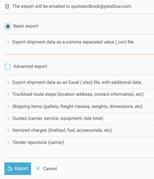 - The advanced export offers 4 additional tabs: Route stops, Items, Quotes, and Charges for linehaul and/or fuel.