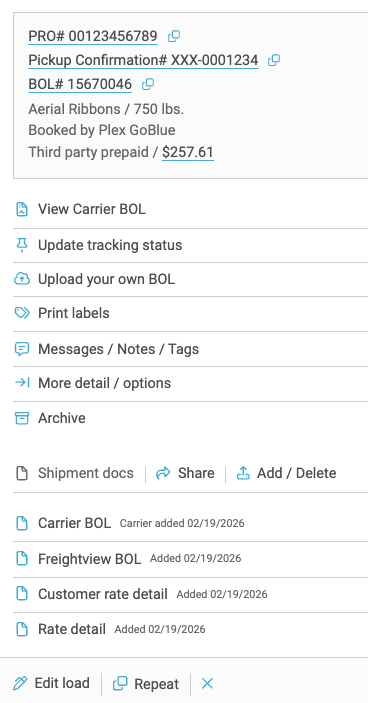You can change the layout by selecting Condensed view; this setting is great for accounts with a larger volume. Click any shipment line from here to access the Documents, Tracking, Messages, and Labels, followed by the three dots that link to the More Details page.