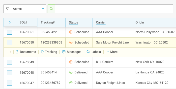 Booked shipments across all modes live within the Shipments Tab. Here you can search, filter, edit, cancel, export, create custom reporting, and more!